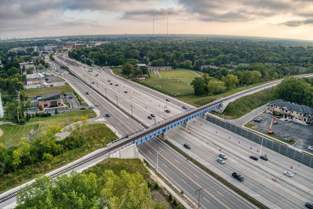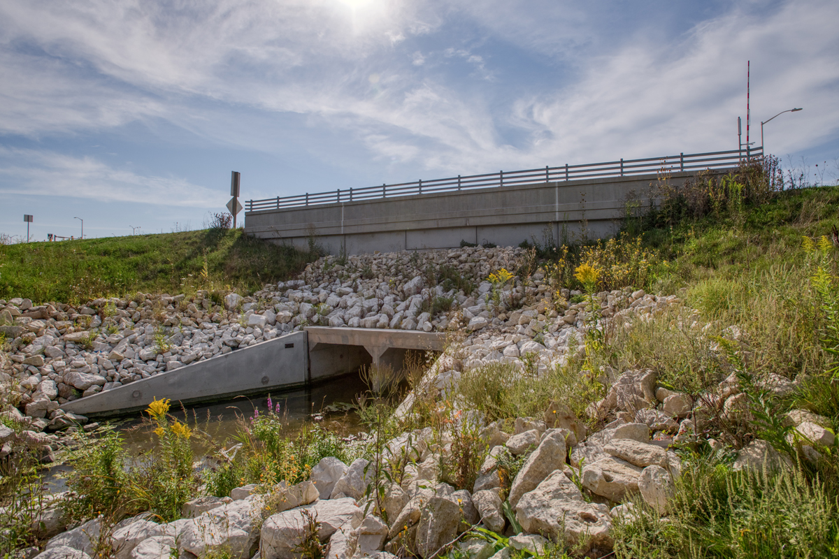 At the heavily traveled Brown Deer interchange, where traffic previously had to traverse short weaves through an outdated tight cloverleaf interchange, HNTB designed a diverging diamond interchange with safer, free-flowing left-hand turns. Besides creating safety benefits, this newly designed interchange had a smaller footprint allowing for additional space for stormwater detention and the development of prairie areas for threatened and endangered species.
