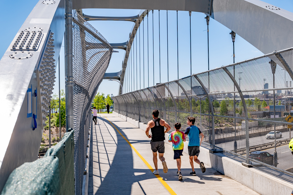 The bridges were redesigned as ADA-compliant structures that provide seamless, scenic entry into the park. A third pedestrian bridge will be installed with a new entryway ramp allowing users to enter the park at grade.