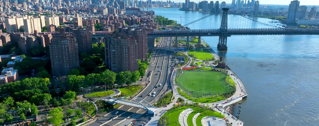 Early design concepts for ESCR focused primarily on flood protection. The original plan proposed raising the half of the park closest to the East River and placing a floodwall along Franklin D. Roosevelt Drive, a six‑lane roadway adjacent to the park. After a complex constructability review with the city agencies, NYCDDC reenvisioned the project as an opportunity to both protect and enhance the park. Rather than elevating only a portion of East River Park, the city elected to rebuild the entire park at an elevation of 8 to 10 feet above prior grade, integrating flood protection infrastructure while modernizing amenities throughout the site. Construction would have closed East River Park for three years.
