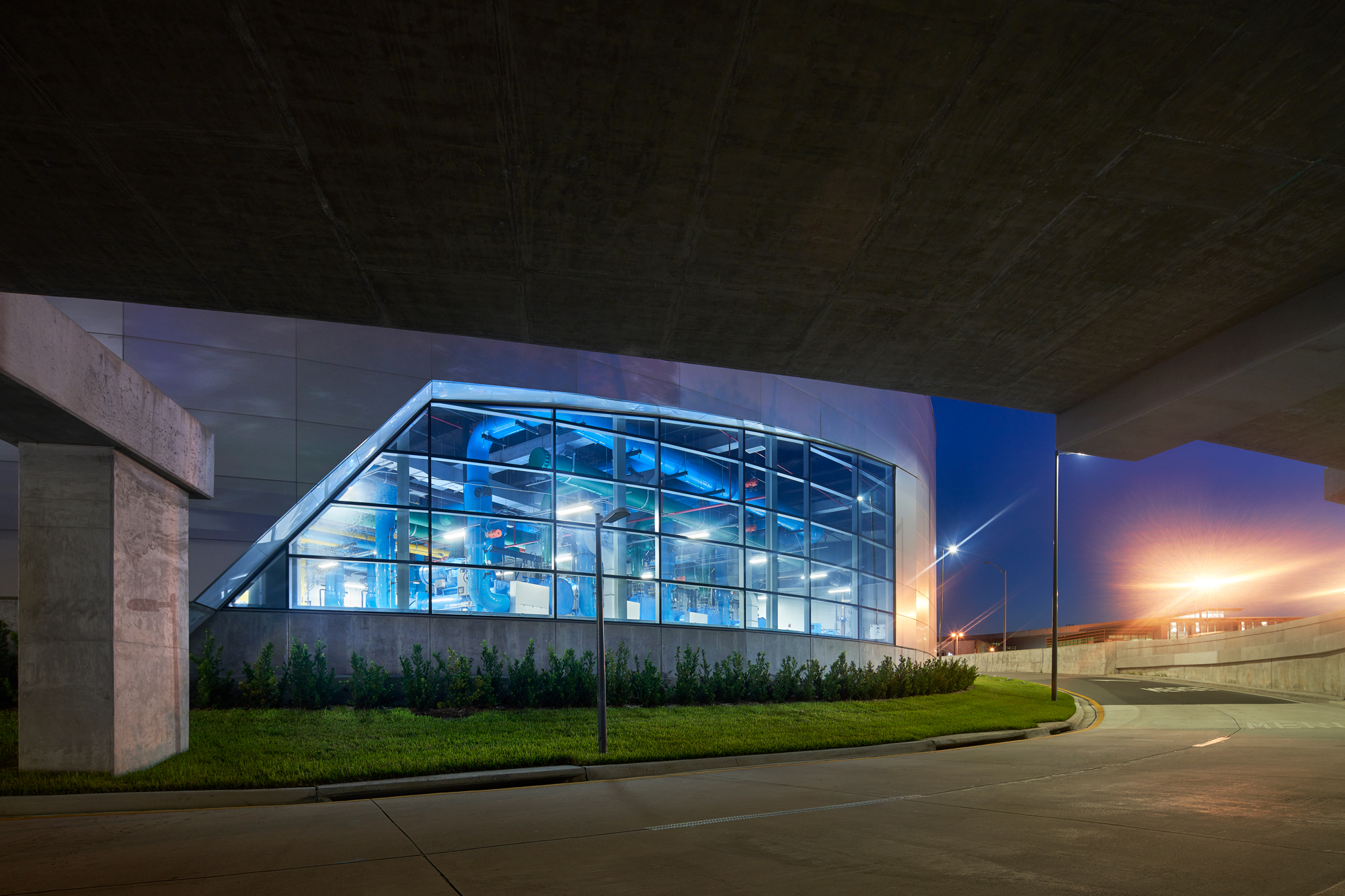 As passengers travel along the parkway, they encounter strategically placed openings in the Central Utility Plant’s facade. Each opening offers a distinct view of different areas of the facility, revealing vibrant equipment and piping. At night, multicolored LED lighting enhances the surprising visuals. The reclaimed water used in the cooling towers does double duty as an architectural water feature.