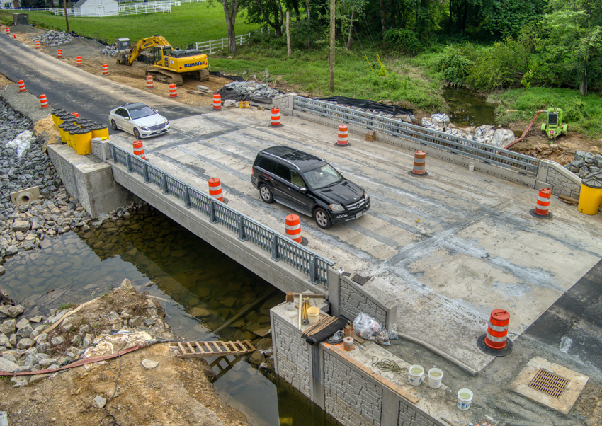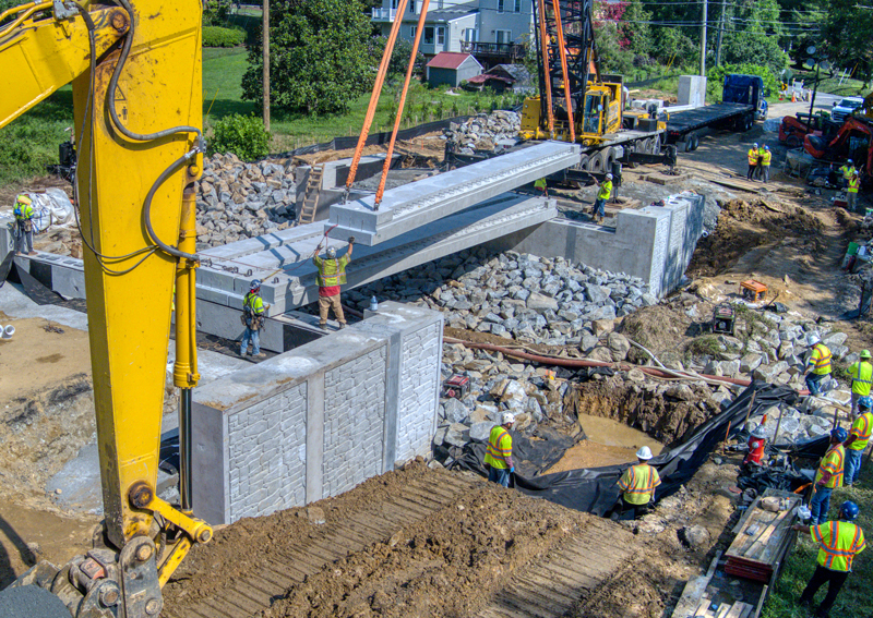 To address these unique site constraints and project requirements, HNTB developed a modular design for VDOT using prefabricated concrete elements for both the bridge substructure and superstructure. The new bridge is nearly 52 feet long and 40 feet wide — substantially larger than the former, single-lane timber bridge. By providing a much larger opening while raising the roadway profile only slightly, the design increases water flow capacity while limiting impacts to the surrounding right-of-way.
