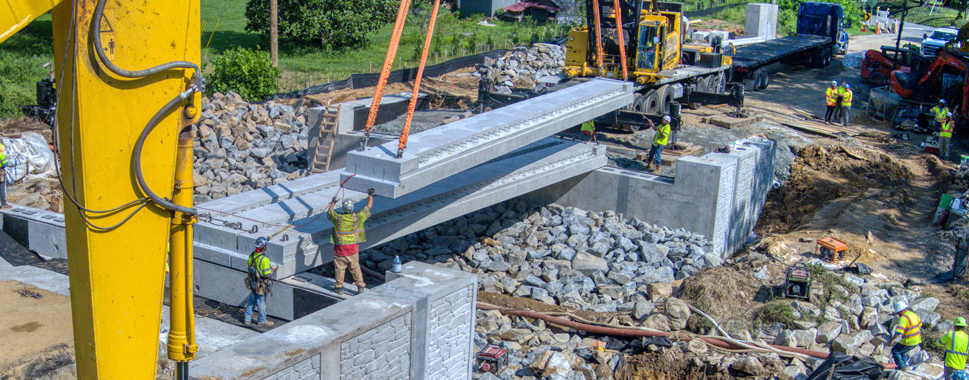 To address these unique site constraints and project requirements, HNTB developed a modular design for VDOT using prefabricated concrete elements for both the bridge substructure and superstructure. The new bridge is nearly 52 feet long and 40 feet wide — substantially larger than the former, single-lane timber bridge. By providing a much larger opening while raising the roadway profile only slightly, the design increases water flow capacity while limiting impacts to the surrounding right-of-way.